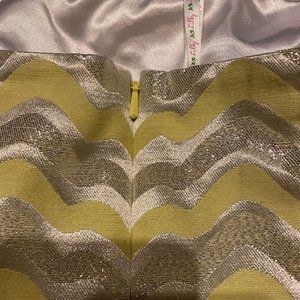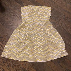 Lilly Pulitzer "Starfruit" sherry yellow and metallic silver printed jacquard print strapless dress.