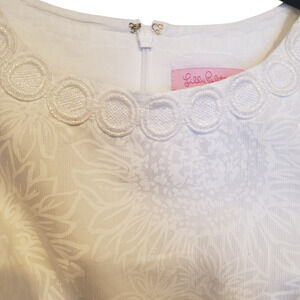 Lilly Pulitzer shift dress in white with a white floral print and circle trim, featuring mini-length, sleeveless details.
