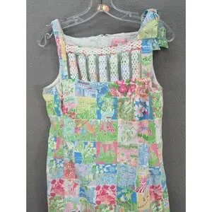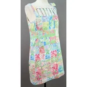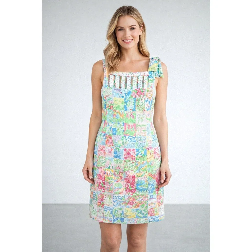Elevate your resort wardrobe with this vibrant Lilly Pulitzer shift dress. Designed with a multicolor patchwork pattern, this sleeveless dress features charming bow straps, offering a playful and feminine touch. Crafted from 100% cotton, it ensures comfort and breathability, making it ideal for warm-weather occasions.