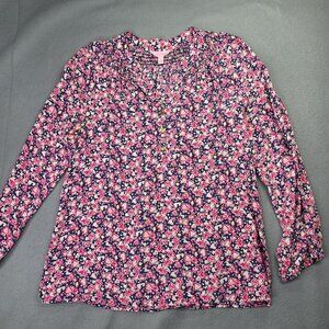 Lilly Pulitzer Shirt Womens Small Navy Pink Silk Heart Print Blouse Preppy Retro