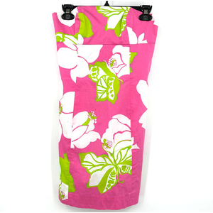 Features beautiful silk blend floral strapless mini dress with white beaded waist band