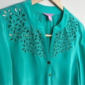 Lilly Pulitzer Silk Elsa Floral Embroidered Eyelet Cutout Blouse in Lagoon
