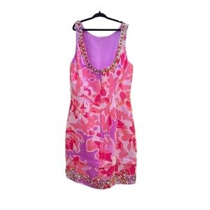 🥒 Lilly Pulitzer Silk Pulaski Embellished Beaded Mini Dress Soiree Purple Pink 0
