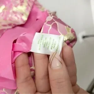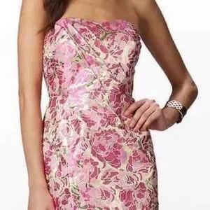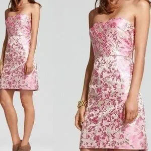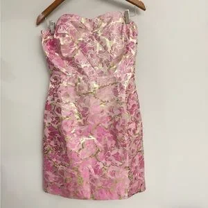 Lilly Pulitzer Silk Raya Dress Pink Gold Jacquard Mini Strapless Sweetheart Sz 8