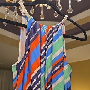 Vibrant mini dress with bold stripes. Features blue, red, green, and white colors. Sleeveless design. Perfect for a casual outing.