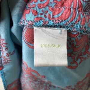 Features: tank top, scoop neck, 100% Silk, material is slightly gathered at neckline, beautiful turquoise blue with coral red design, summer, silk, cruise wear, coastal