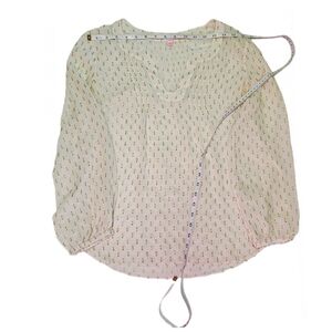 silk, metallic, lightweight, flowy, cream, white, gold, stretch elastic wrist, delicate, feminine, flirty, bohemian, boho, gypsie, gypsy, prairie, cottage, loose, chiffon, blouse, babydoll