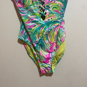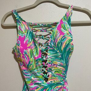 Lilly Pulitzer Isle Lattice One Piece Swimsuit Swim Bathing Suit in Shady Lady. Lattice knot plunge detail on front and open back. Pink with colorful palm leaf print. Adjustable straps. Has removable padding.