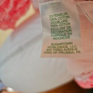 pink white floral, lace trim shirt, 3/4 sleeve blouse, keyhole back top, casual cotton blouse, floral lace blouse, pink boho top, Lilly Pulitzer blouse, embroidered cotton top, women's cotton blouse, lightweight summer top, breathable fabric shirt, Lilly Pulitzer clothing, embroidered women's top, 1970's
