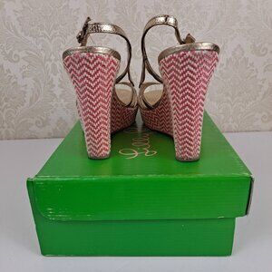These fun wedge heels will take you anywhere. The gold metallic straps have a buckle closure for a personalized fit. Pink and white woven chevron stripes decorate the wedge heel. 4.75" heel. Pair them with your favorite dress, skirt, shorts or pants.
