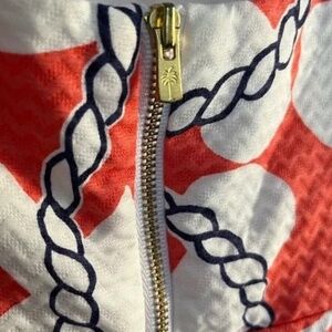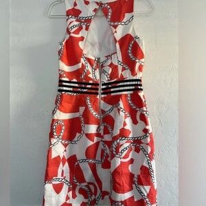 Fun nautical style summer mini suitable for all warm weather occasions. Slim-fitting button-detail waist. Buttoned back cut out with zipper. Classic Lilly Dress comes from a pet free/smoke free home. Worn once. Excellent condition. I wear s 6-8 in today's dress sizes and this fits me perfectly.
