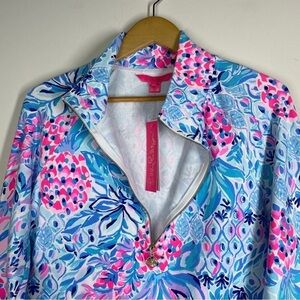 UPF 50+ straight fit, half-zip pullover with long sleeves, logo zipper pull and a shortened length. Some colors are more vibrant in person.