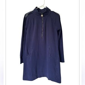 Lilly Pulitzer Skipper Popover dress in navy. Mock neck with 1/2 zip. Long sleeves with lace detail. Front pockets. Cotton blend. French Terry knit. Machine wash. Bust 19” length 32”. Very good condition. Size S