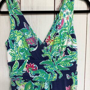 Add a playful coastal touch to your wardrobe with this Lilly Pulitzer Sloane Maxi Dress featuring the charming Trunk Show print—a vibrant blue-green pattern with playful turtles and palm silhouettes. This women’s Medium is in excellent used condition with just some light fading on the blue areas—a flattering detail on this striking print. The flowing maxi length and easy fit make it a versatile pick for beach sunsets, summer weddings, or every-day standout style.