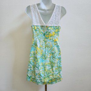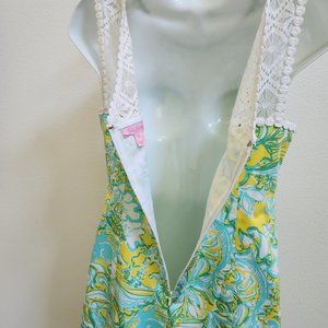 Pre-owned Lilly Pulitzer Sofia Shift Dandelion Yellow beach Gypsies, back zip closure, sleeveless, it has a couple stains, one inside part and one on chest as you can see at picture, signs of wear.