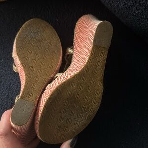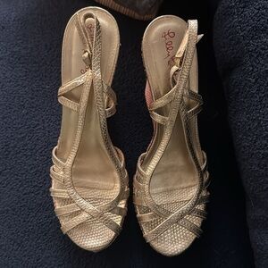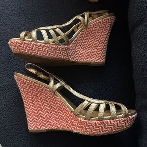 Lilly Pulitzer Sophie gold and pink chevron wedge sandals with a unique pattern. Perfect for adding a pop of color to any outfit. Good condition.