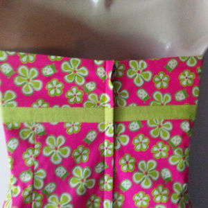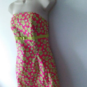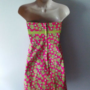 Lilly Pulitzer strapless pink, white, and green floral print bare shouldered above knee dress size 10 medium with cute little bow in front. Concealed back zipper and hook. Excellent condition.