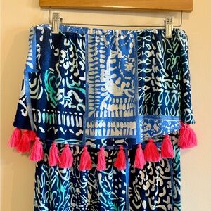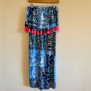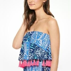 Chic Lilly Pulitzer strapless dress with vibrant blue and pink patterns. Features playful tassels. Ideal for summer outings.