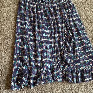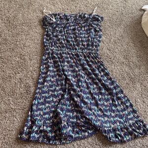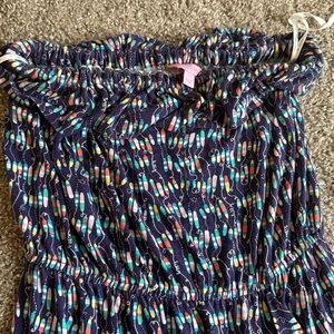 Vibrant strapless dress by Lilly Pulitzer. Features a playful multicolor pattern. Perfect for summer outings. The base color looks like a deep blue or purple with cute little geometrical prints in different colors. It is strapless it is a size large. The fabric is a little bit white. It is 96% rayon and 4% spandex. It is extremely stretchy but unstretched it’s about 16 inches and from the top to bottom somewhere around 30 inches.
