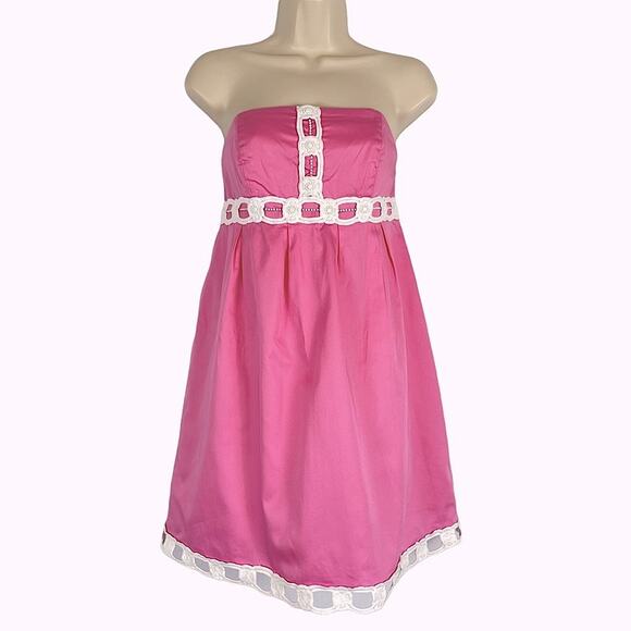 Lilly Pulitzer Strapless Lined Fit Flare Resort Wear Dress Hot Pink White Lace Trim Size 4-Excellent pre-loved Condition