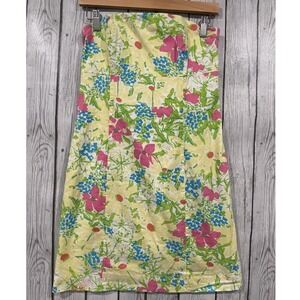 Keywords: Lilly Pulitzer, strapless, sundress, floral print, summer dress, resort wear, vacation dress, party dress, pink flowers, blue flowers, yellow dress, lightweight, preppy