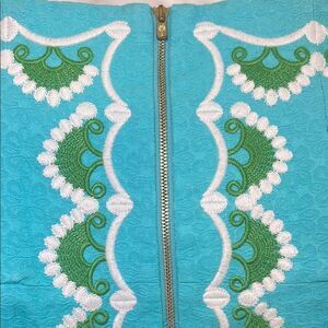 Chic strapless dress in aqua. Features intricate embroidery. Perfect for stylish occasions.