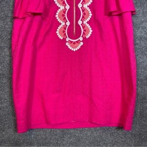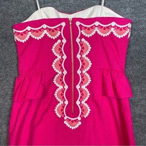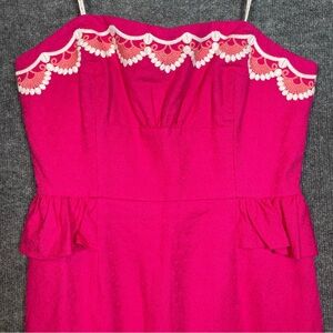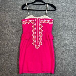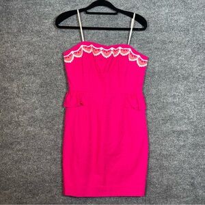 Chic strapless dress by Lilly Pulitzer. Features a vibrant pink color. Elegant lace detailing on the front and back. Perfect for any occasion.
