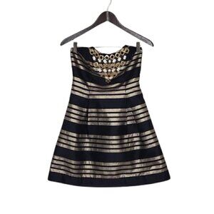 Lovely navy blue strapless fit & flare mini dress. A-line. Sweetheart neckline. Gold embellishments and white beaded detail. Princess seaming. Subtle pleating below the waist. Features boning for a secure fit. Gold zipper on the back. Fully lined.