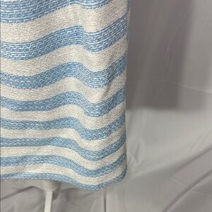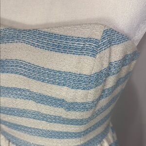 This elegant strapless dress features a chic blue and white striped pattern. Perfect for any occasion, it offers a flattering fit and timeless style. PreOwned