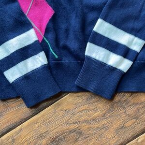 Lilly Pulitzer cotton sweater, Size Small, navy long sleeve, v neck, pink and off white accents, armpit to armpit approximately 16” across, approximately 23” long, lightly worn