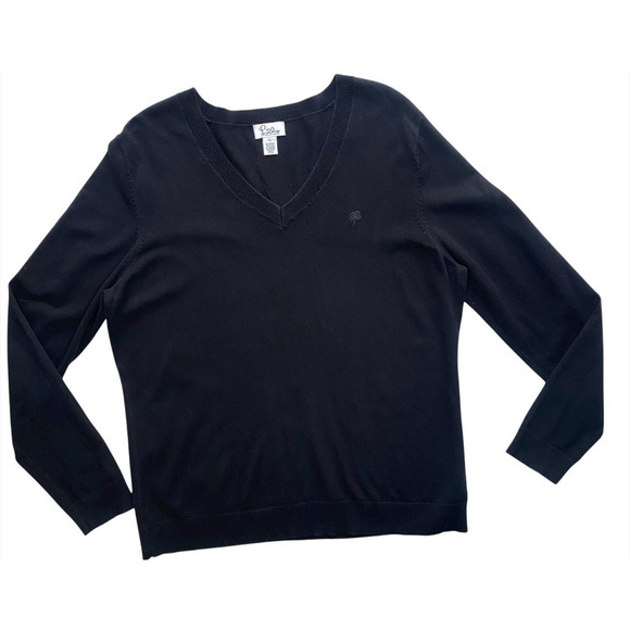 Lilly Pulitzer Sweater Women's Size XL Black V-Neck Long Sleeve Top. Solid black sweater with palm tree logo. Good used condition. No rips or stains. Fabric shows normal signs of wear.