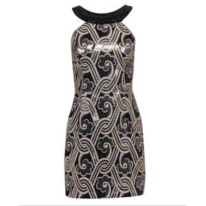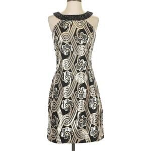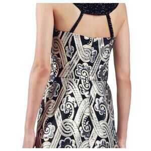 Stunning Lilly Pulitzer Sydney Dress in a luxe black, gold, and silver metallic brocade. This sleeveless cocktail dress features a chic mock neckline with a beaded halter-style strap and a fitted silhouette perfect for formal occasions or holiday parties. Style #436874016. Made of 81% polyester and 19% metallic for that perfect amount of shine. Measures approx. 35” from shoulder to hem. No major flaws—minor wear on fabric upon close inspection, but overall excellent condition.