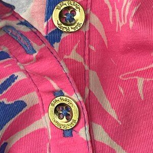 Dive into summer vibes with this vibrant Lilly Pulitzer tank top! A playful pineapple print in bright pink and royal blue makes this sleeveless top a standout piece. The design features a scoop neckline with a decorative button placket, adding a touch of charm to the casual silhouette. Perfect for a sunny day at the beach, a casual brunch with friends, or a tropical vacation getaway.