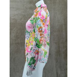 Lilly Pulitzer Target Top Womens Small Pink Green Floral Button Up Nosey Posey Long Sleeves Sheer Collared 100% Cotton Preppy Resort Summer Colorful Tropical Vacation