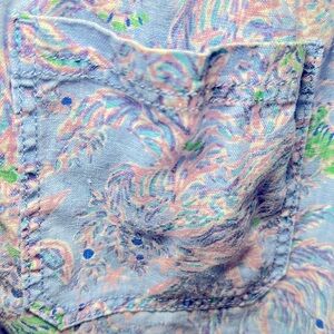 Add color and brightness to your chic look wearing the Lilly Pulitzer Taron Pants and hear compliments. Straight, tapered fit. Mid-rise silhouette. Elasticized waistband with drawstring. Two side pockets. Two back patch pockets. Pull-on style. Allover multicolored print. 100% linen. Machine washable.