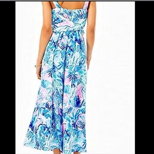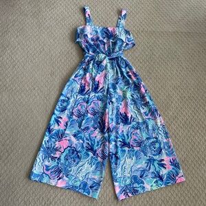 Lilly Pulitzer Tasely Jumpsuit - Saltwater Blue Shade Seekers Print - Size 6 - Boho/Vibrant/Coastal/Beachy - NWOT. This stunning jumpsuit from Lilly Pulitzer features a straight flounced neckline, wide adjustable button straps, a colorful sea-inspired print, wide palazzo-style cropped legs, soft and lightweight fabric, sash tie that's connected to the jumpsuit and can be tied in the front or back, and hidden back zip with hook/eye closure. Wear this breezy, beautiful jumpsuit with strappy sandals or heels for special occasions, strolling along the beach, lunch with friends, or a night out. Excellent condition - NWOT - there's a tiny place on the right strap where the stitching is coming out - it's an easy fix for someone who can sew - please see last photo.