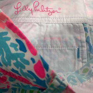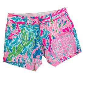 These are preowned shorts by Lilly Pulitzer. They are in the let’s cha cha print which is a tropical multicolor coral reef themed print. The shorts have no holes stains or flaws.