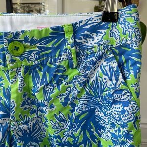 Lilly Pulitzer The Callahan Short in Limeade Biggest Fan Print. Logo button and zip closure. Belt loops. The back welt pockets are still stitched shut and there are two front hip pockets. 100% cotton. Laying flat measures 15 inches straight across the waist with a 7.5 inch rise and 5” inseam.