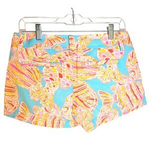 Lilly Pulitzer The Walsh Pink, Blue, & Orange Summer Short in Lenore Print. Features a low rise, straight fit, zip closure with signature gold button, and four pockets.