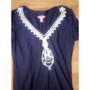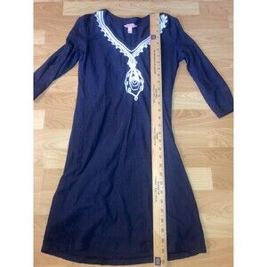 The Lilly Pulitzer Tidewater Cotton Tunic Dress is a stylish and versatile piece perfect for various occasions such as travel, parties, or casual outings. Made from lightweight and stretchy cotton knit fabric in a solid navy blue color, this dress features a V-neckline, bell sleeves, and embroidered accents. The bohemian and nautical themes make it a great choice for beach or tropical settings, adding a touch of designer flair to your wardrobe. With its short length and pullover closure, this shirt dress in size S is a must-have for any fashion-forward woman looking for a chic and comfortable cover-up option.