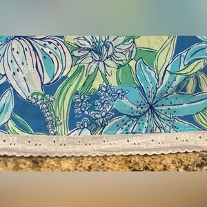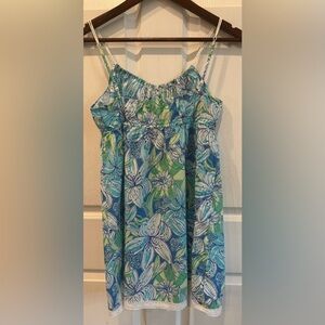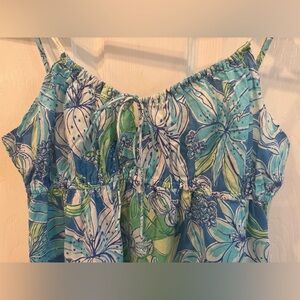 Has adjustable straps. Embrace the warmth and charm of summer with the Lilly Pulitzer Tie Front Mini Slip Dress in a delightful blue hue. The dress features a vibrant floral pattern that's perfect for sunny day events or evening soirees. With its sleeveless design and 100% cotton material, it promises both comfort and style during the hottest months.
