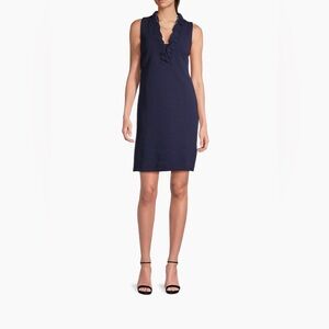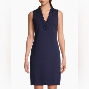 Chic and classic, this Lilly Pulitzer Tisbury Shift Dress in navy is a must-have for any wardrobe. Featuring a flattering V-neckline with delicate ruffle trim, this sleeveless dress is both elegant and comfortable. The subtle textured stripes add a touch of sophistication, making it perfect for brunch, events, or a polished everyday look.