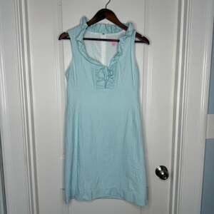 Lilly Pulitzer Tisbury Shift Dress in a refreshing Succulent Blue Lucky Catch print. This sleeveless shift dress features a charming ruffle detail around the neckline and a tie-front accent, offering a playful yet elegant silhouette. Perfect for warm-weather outings, cocktail parties, or a stylish casual look. Made from a comfortable, breathable fabric that holds its shape. In excellent pre-owned condition, with no visible flaws or signs of wear.