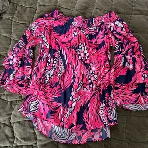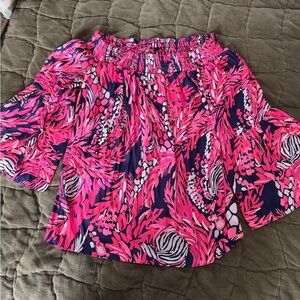 Off the shoulder Tobyn top from Lilly Pulitzer. Pattern is “It’s a jungle in here.” Excellent condition. So cute with white shorts or jeans. Flared sleeves to keep you warm on cool nights!