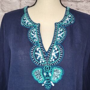 Lilly Pulitzer tunic top with split v neck, 3/4 sleeves and beaded and sequined detail. Great preloved condition.
