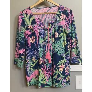 Lilly Pulitzer Tilda Tunic top Blue Pink Floral 3/4 Sleeves Womens sz Small EUC.