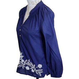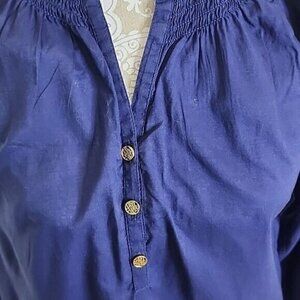 The tunic features logo buttons, button accents, and floral embroidered details, adding a touch of elegance to the overall design. It is available in size XS and has a regular fit. This top tunic is a versatile piece that can be worn in any season, whether it's winter, summer, fall, or spring. Smocking around neckline and elastic cuffs.Gently used condition with no flaws.