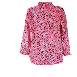 The Lilly Pulitzer Top in XS features a vibrant Sherida Pink Cheetah Leopard Animal Print, perfect for a casual occasion. This lightweight blouse is made from 100% cotton with a woven fabric type and a V-neckline with ruffle accents. With long sleeves and a pullover closure, this top is stylish and comfortable, suitable for all seasons and featuring a regular fit. Easy to care for with machine washable instructions, this top is a fashionable choice for women looking to make a statement with their outfit.
