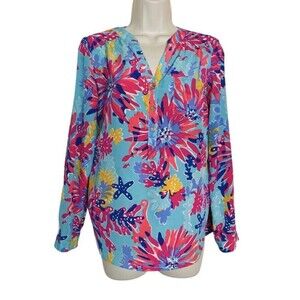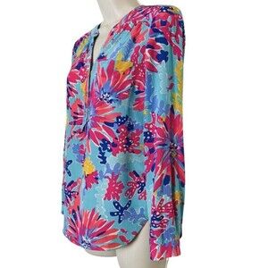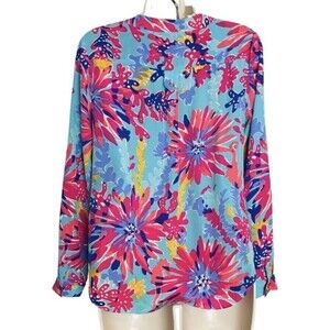 Lilly Pulitzer Trippin and Sippin Elsa Silk Popover Blouse Size XS Pink Flowers Pattern is Trippin and Sippin featuring Beach Theme elements...