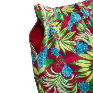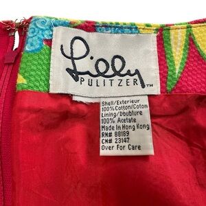 Brighten up your wardrobe with this vibrant Lilly Pulitzer mini skirt featuring a bold tropical floral print in blue, green, and yellow on a rich red background. Made from 100% cotton with a 100% acetate lining, this skirt offers structure and comfort. The feminine scalloped hem adds a playful touch, perfect for resort wear, vacation outfits, or sunny summer days. Side zip closure. Size tag is missing—please refer to measurements for accurate fit.